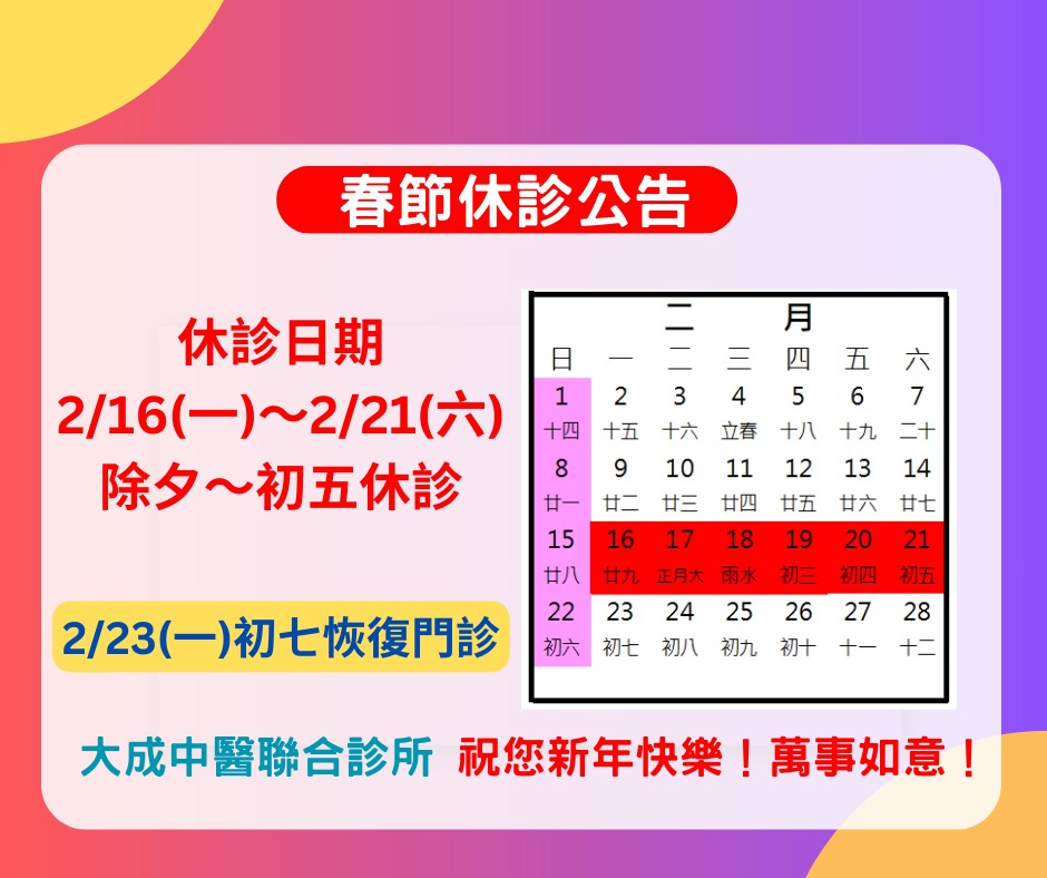 春節2/16(一)~2/21(六)除夕~初五休診,2/23(一)恢復門診